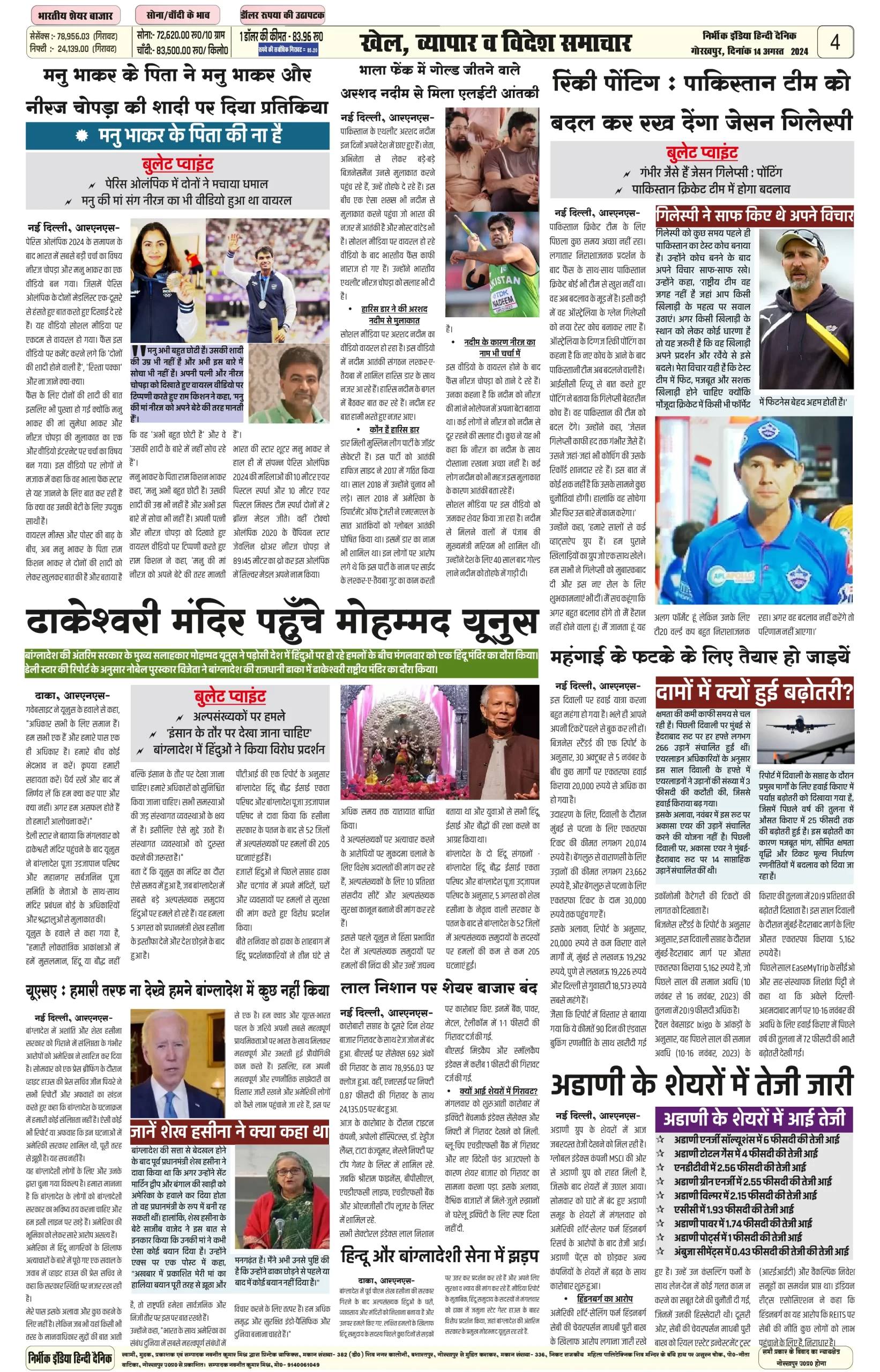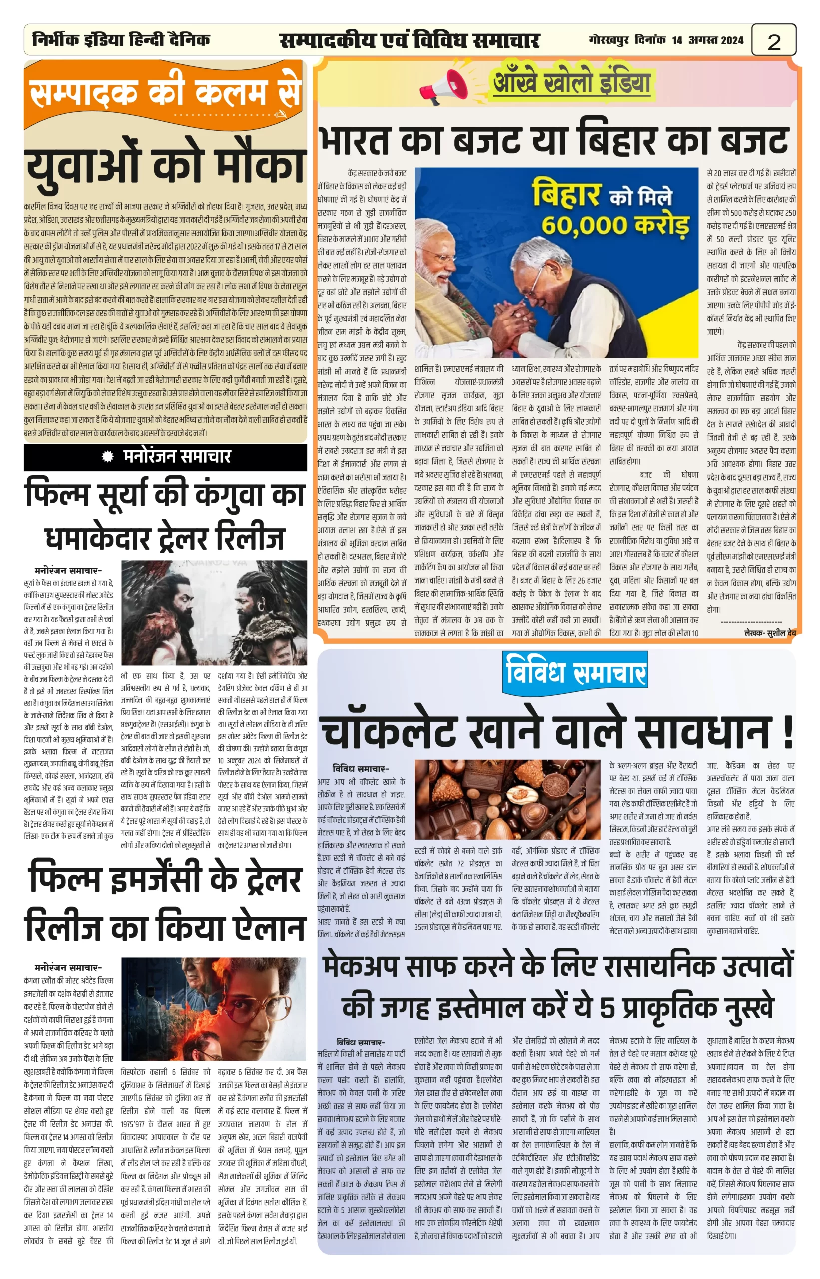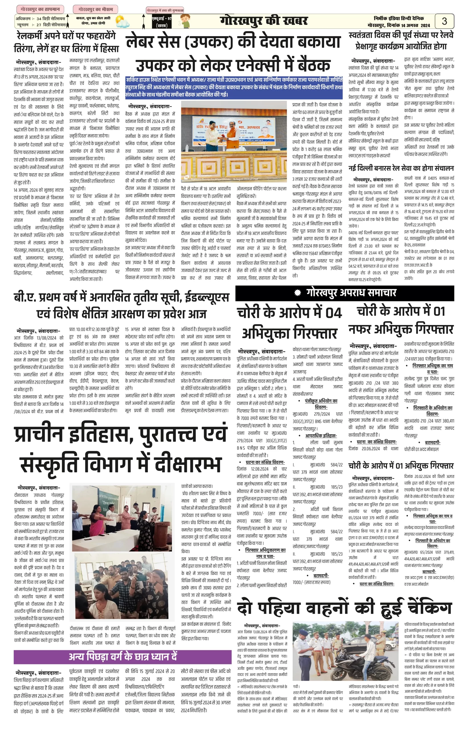 14 August 2024 Nirbhik india newspaper Gorakhpur