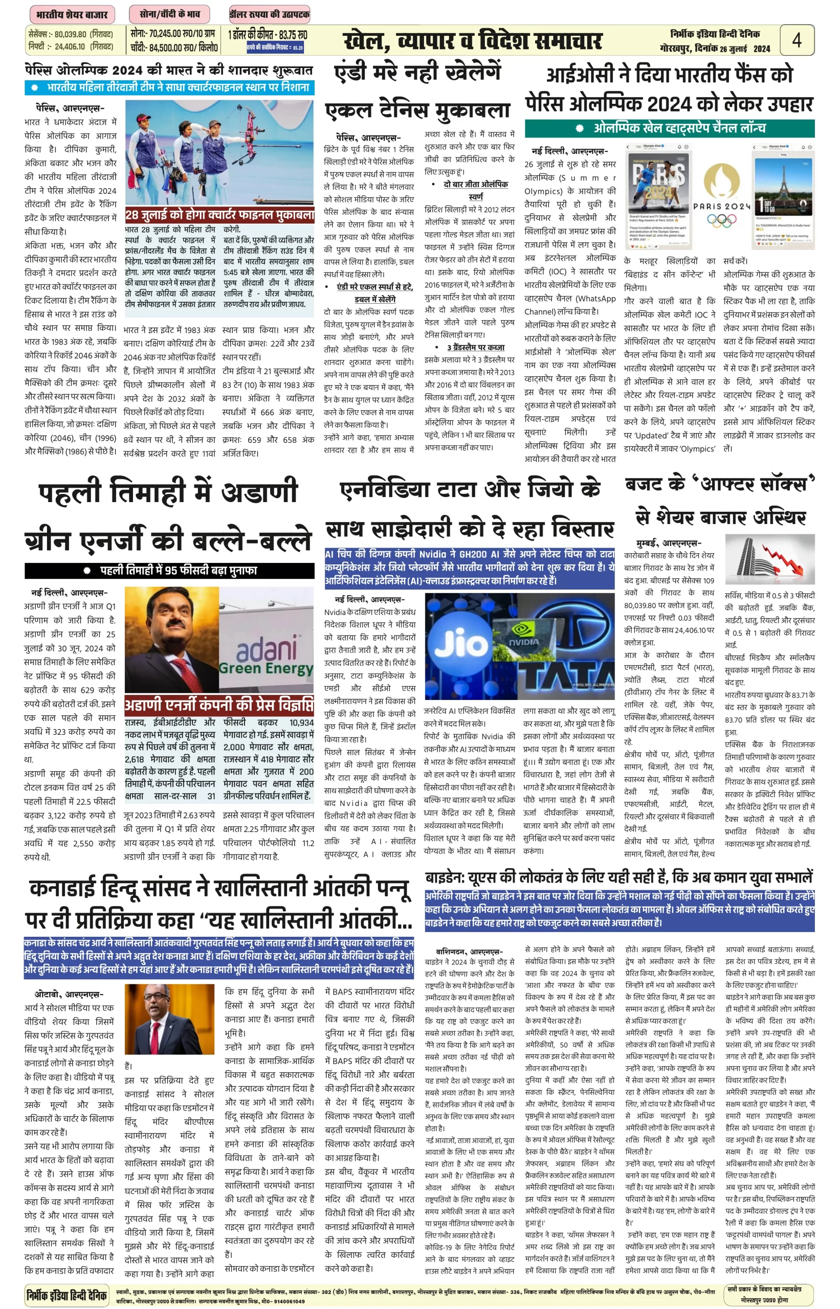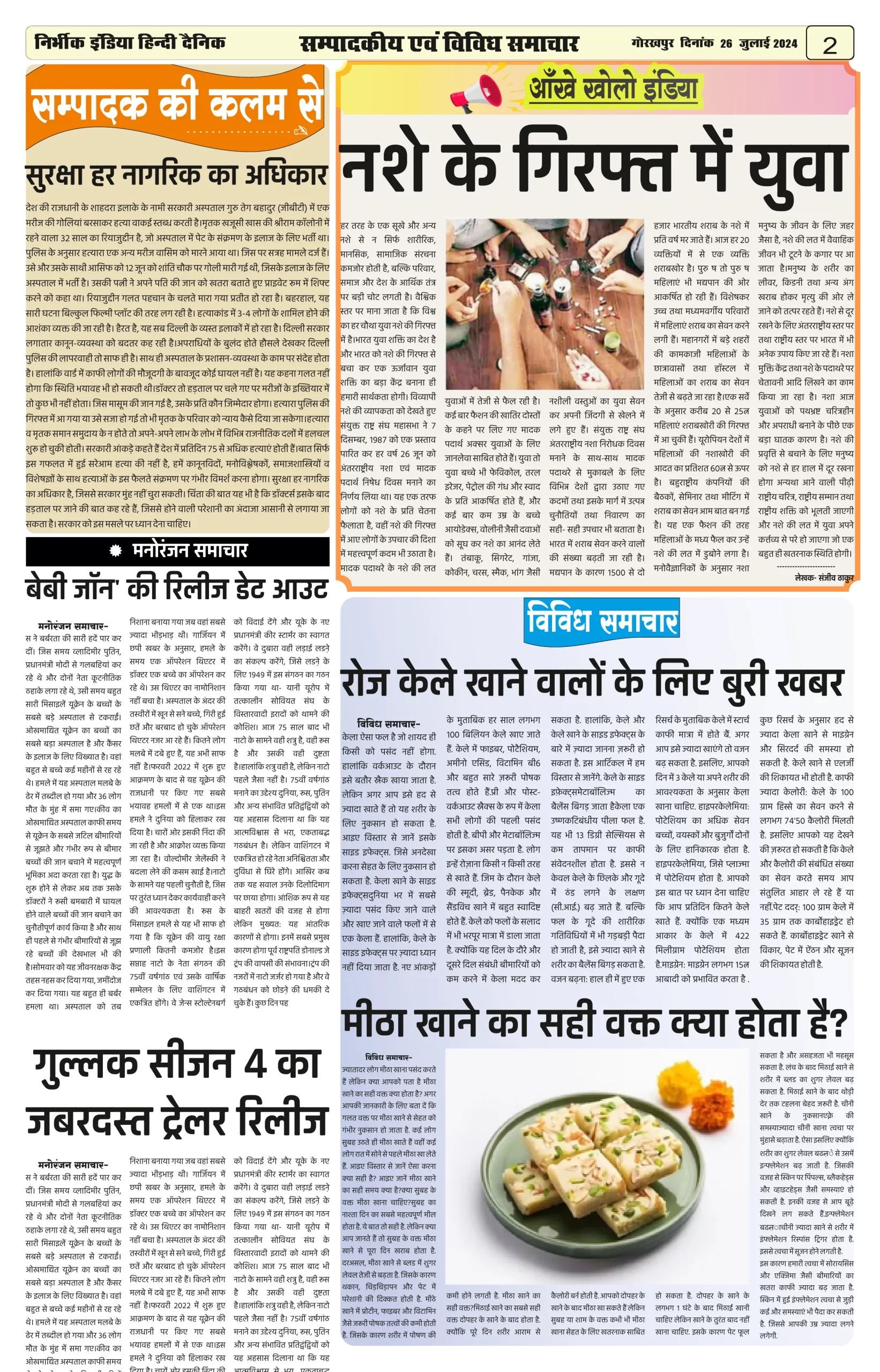 26 July 2024 Nirbhik india newspaper